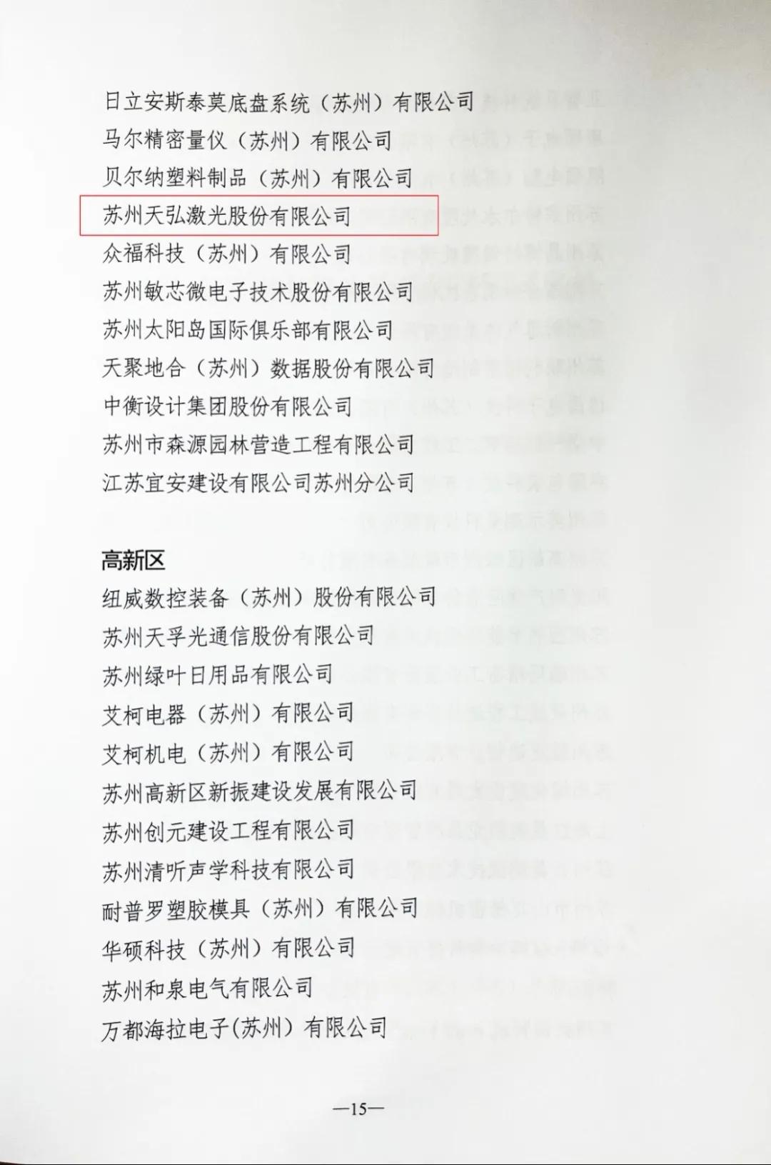 據(jù)蘇州市人力資源和社會保障局消息,根據(jù)蘇州市協(xié)調(diào)勞動關(guān)系三方委員會《關(guān)于做好2020年度蘇州市勞動關(guān)系和諧企業(yè)與工業(yè)園區(qū)培育評估工作的通知》(蘇調(diào)勞辦〔2021〕1號)的文件要求,經(jīng)蘇州市各參評單位提交申報材料,各市區(qū)協(xié)調(diào)勞動關(guān)系三方委員會推薦,蘇州市第三方評估機構(gòu)實地上門評估,蘇州市協(xié)調(diào)勞動關(guān)系三方委員會成員單位綜合審議,擬授予蘇州天弘激光股份有限公司等331家企業(yè)“2020年度蘇州市勞動關(guān)系和諧企業(yè)”稱號。