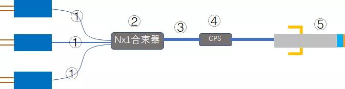 藍(lán)光光源系統(tǒng)的組成比較簡(jiǎn)單,多數(shù)是將低功率的光纖耦合泵浦LD模塊,通過光纖合束器,合束到更粗的光纖之中,然后經(jīng)過端帽鎧纜輸出,結(jié)構(gòu)基本如下圖所示: