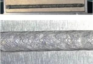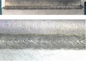 拼焊中心功率3800W,環(huán)形功率2000W,速度80mm/s,sin擺動焊接,焊縫宏觀形貌如圖9,焊縫截面形貌如圖10。疊焊中心功率3800W,環(huán)形功率2000W,速度80mm/s,sin擺動焊接,焊縫宏觀形貌如圖11,焊縫截面形貌如圖12。焊縫外觀成型均勻一致,并無虛焊、焊渣和爆孔等缺陷,焊縫內(nèi)部無裂紋缺陷。