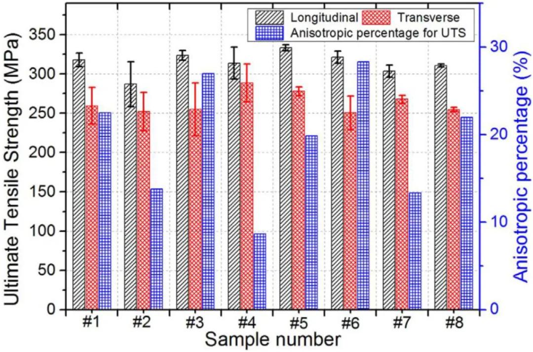在另一項研究中,利用變極性-CMT(純CMT、CMT+Pulse (CMTP)和VP-CMT)設(shè)備和層間等待時間研究了Al-6Mg合金構(gòu)件的組織和機(jī)械特性。與其他電弧模式相比,VP-CMT模式可使柱狀晶轉(zhuǎn)變?yōu)榈容S晶和細(xì)化晶,這是因為該模式可降低熱輸入,提高機(jī)械性能。所制備的Al-6Mg合金零件的UTS比標(biāo)準(zhǔn)的Al-6Mg合金增加了2.77%。但拉伸性能在橫向和縱向上呈各向異性,其范圍為8-27%,如圖5所示,這是由微孔造成的。Ayarkwa等進(jìn)行了一項研究,評估了電極正時間周期(% EP)對ER5556鋁線的微觀結(jié)構(gòu)、機(jī)械行為和氧化物去除的影響。結(jié)果表明,較高的EP值使晶粒尺寸明顯增大,但不影響其機(jī)械性能。
