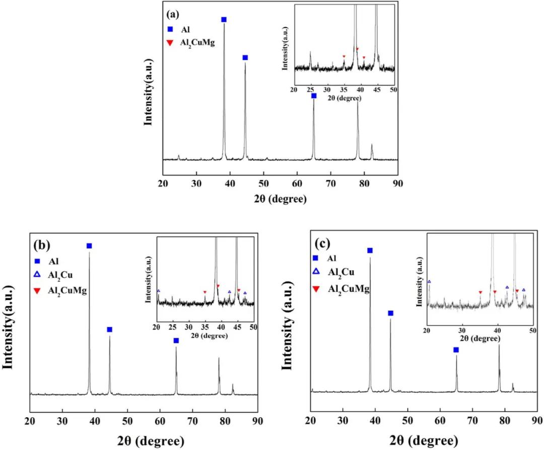 圖7 (a) 3.6Cu/2.2 Mg時的XRD譜圖;(b) 4銅/ 1.8毫克;(c) 4.4立方/ 1.5毫克。