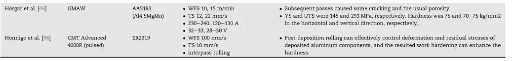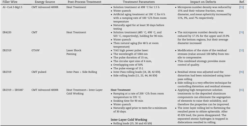 要實現(xiàn)產(chǎn)品所要求的目標(biāo),最重要的問題之一就是產(chǎn)品制造工藝的選擇。WAAM工藝近年來被廣泛應(yīng)用于鋁零件的制造中,但仍有許多缺陷需要進(jìn)一步研究。采用WAAM工藝制作的鋁件需要進(jìn)行后處理,以消除產(chǎn)生的缺陷(氣孔、殘余應(yīng)力和變形、裂紋),提高材料性能。沉積質(zhì)量的問題可以通過應(yīng)用適當(dāng)?shù)暮筇幚韥硐?。為了?yōu)化WAAM參數(shù),并找出這些缺陷的局限性,提高材料性能,開展了多項研究。本節(jié)將重點介紹應(yīng)用的后處理和WAAM參數(shù)的優(yōu)化,以提高WAAM制造的鋁構(gòu)件的質(zhì)量。表2列出了應(yīng)用后處理來提高WAAM制造的鋁構(gòu)件質(zhì)量的不同調(diào)查的比較。