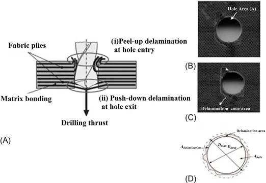 (A)剝離、推起分層現(xiàn)象的機(jī)理;(B)鉆孔面積為所鉆孔;(C)分層區(qū)域識別;(D)基于損傷面積的分層計算。