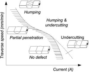 GTAW工藝是最常見的鈦焊接工藝之一,因為這為焊工提供了一個高水平的控制過程,以避免缺陷的形成和提供一致的質(zhì)量。一般來說,GTAW的過程窗口是由焊接電流范圍和形成無缺陷焊縫所需的移動速度來定義的,并避免在高移動速度下由于流動不穩(wěn)定而引起的局部滲透、欠切或駝峰,如上圖所示(Short, 2009)。