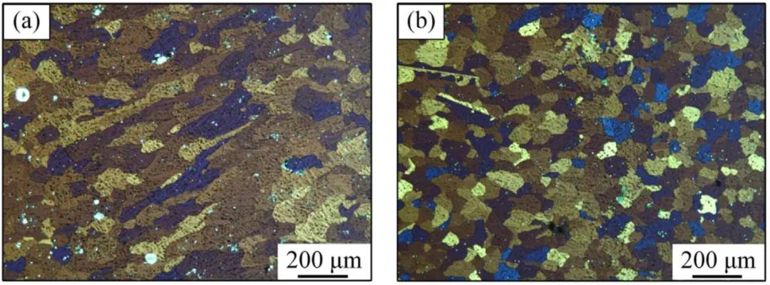 圖8 (a)無Ti的WAAM構(gòu)件層間組織; (b) 用Ti以后。