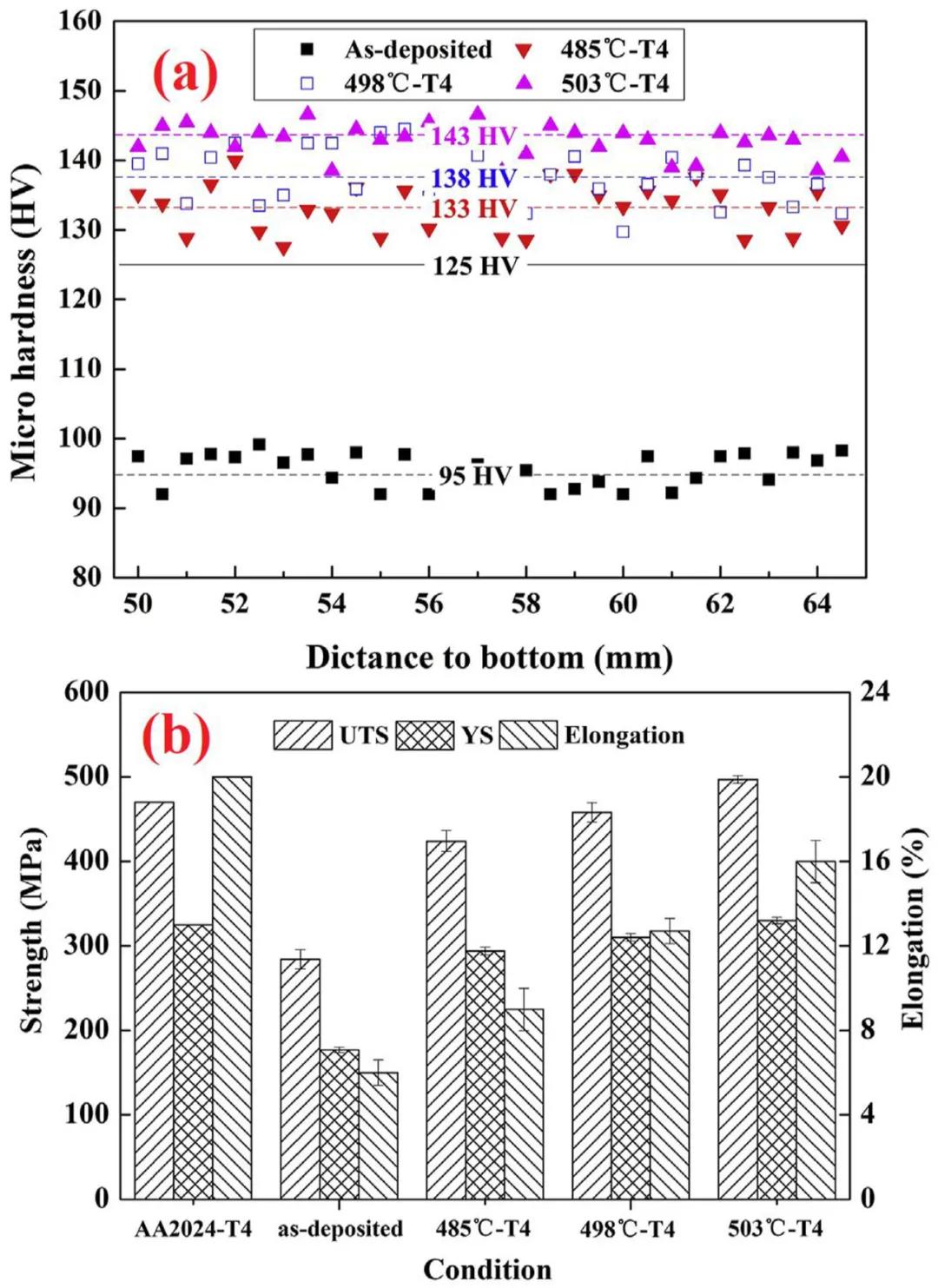 另一項改善CMT沉積零件性能的研究是采用后熱處理。從上到下,各組分的微孔形態(tài)和數(shù)量變化明顯。A357合金的拉伸性能接近于各向同性。熱處理后的鋁基體形成納米顆粒,提高了合金的強(qiáng)度和顯微硬度。2024鋁合金鍍層通過固溶處理(485℃,498℃,503℃),保持90 min,水淬后自然時效(室溫下48 h)提高了鍍層性能。如圖9所示,在503℃固溶處理溫度(UTS: 497 MPa, YS: 330 MPa, EL: 16%,顯微硬度143HV)下,合金的機(jī)械性能有所提高,使沉積的構(gòu)件滿足應(yīng)用要求。