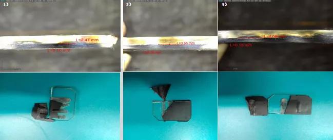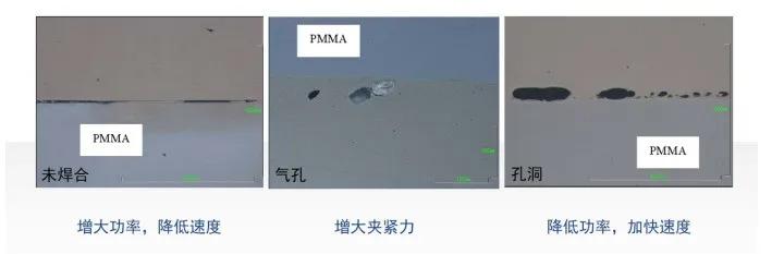 那么塑料焊接后會(huì)產(chǎn)生哪些缺陷呢?焊接缺陷一般包括未焊合、氣孔和孔洞,下圖是焊縫的縱截面形貌,左圖可以看到上下兩層材料中間有黑色未焊合區(qū)域,那么可以增加功率或降低焊接速度來避免這種缺陷,中間這幅圖可以看出存在氣孔,可以增加焊接夾緊力來消除缺陷;右圖黑色部位為焊接孔洞,這是能量密度高造成的,因此可以降低功率,增加焊接速度。