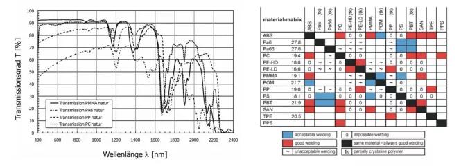 左圖是幾種透明塑料材料對(duì)波長(zhǎng)的透過率,可以看出在塑料材料對(duì)1200nm以下波長(zhǎng)的透過率都很高,對(duì)于1200nm以上波長(zhǎng)吸收率有所增加。一般說來,當(dāng)上層材料激光透過率高于50%,下層材料激光透過率低于20%時(shí),會(huì)獲得較好的激光焊接效果。右邊這個(gè)圖表為常用塑料材料的可焊性。