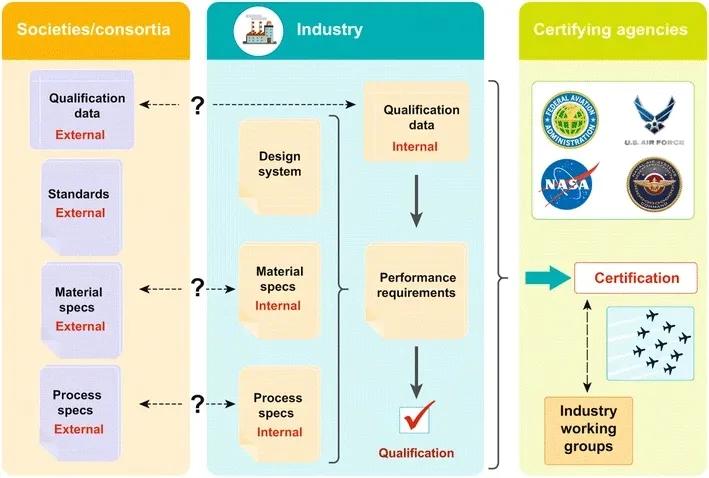 上圖中的示意圖展示了Q&C景觀的高級元素。在技術實施的早期階段,行業(yè)通常必須完全依賴內(nèi)部專有材料和工藝規(guī)范來進行內(nèi)部資格鑒定工作和監(jiān)管機構的認證。開發(fā)這樣的內(nèi)部文件通常是冗長和昂貴的。當sdo開發(fā)適當?shù)囊?guī)范和標準時,公司可以在內(nèi)部文檔和外部文檔之間進行選擇。一般來說,使用業(yè)界接受的外部規(guī)范和標準可以簡化管理機構的工作,并通過在整個業(yè)界為諸如AM等新技術的關鍵要素建立最低限度可接受的要求方面“公平競爭”來提高安全。例如,對使用該技術感興趣,但可能沒有足夠的資源來開發(fā)全面的內(nèi)部規(guī)范或標準的小型公司,可以使用外部文檔來實現(xiàn)健壯的Q&C流程。