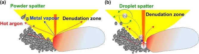 激光束在熔體軌跡中的位置對濺射演化的影響示意圖:(a)激光束定位在熔體軌跡上時,會形成粉末濺射;(b)激光束定位在熔體軌跡前面時,會形成液滴濺射。