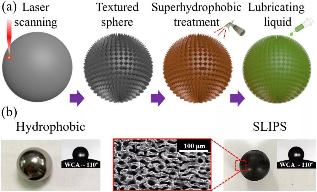 圖1. (a) SLIPS小球制備流程,(b)飛秒激光結(jié)構(gòu)化小球表面掃描電鏡微觀形貌