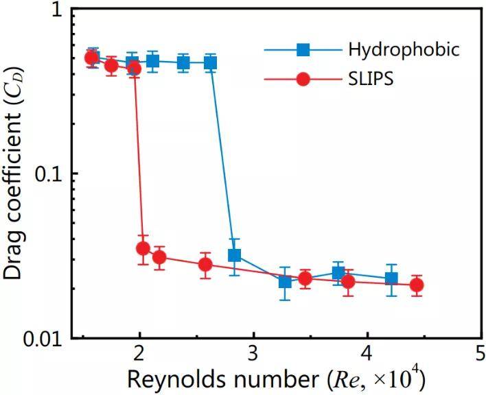 圖5. SLIPS小球可在更廣參數(shù)范圍內(nèi)降低水下運(yùn)動(dòng)小球的阻力系數(shù)