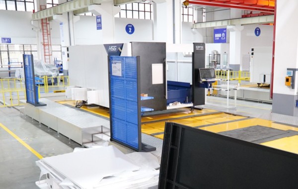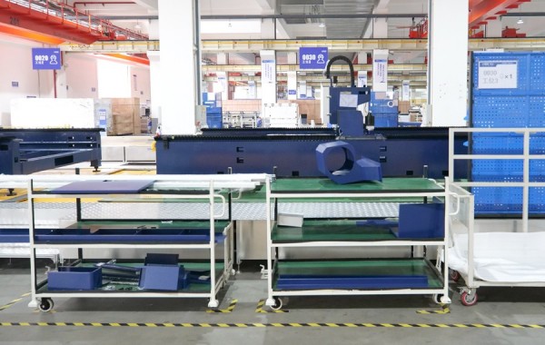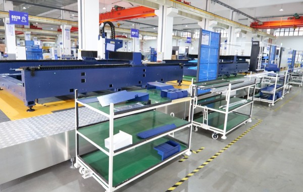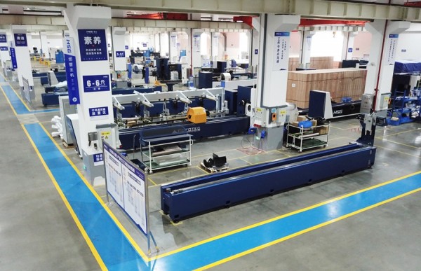 該車間投入500萬用于建設(shè)智能生產(chǎn)流水線,實現(xiàn)激光切割機流水線式生產(chǎn),智能化立體物料倉儲,以及不同生產(chǎn)工序間AGV物料自動運轉(zhuǎn)。