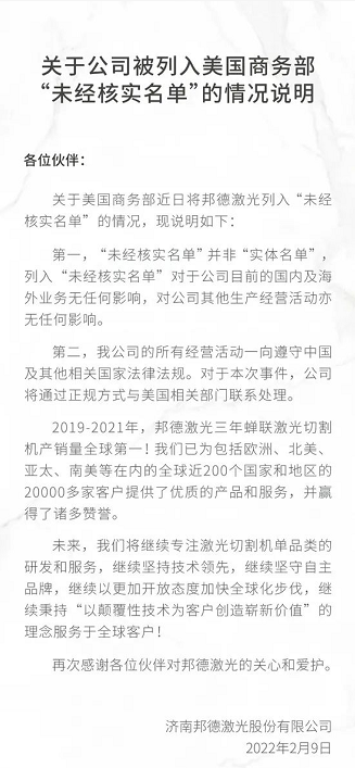 近日,有消息稱,美國商務(wù)部將邦德激光列入“未經(jīng)核實(shí)名單”,為此,幫德激光對(duì)此情況進(jìn)行了說明。情況說明如下圖: