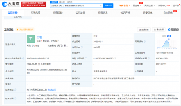 天眼查顯示,2月11日大族激光(荊門)新能源裝備科技有限公司成立,法定代表人為王瑾,注冊資本5000萬元。據(jù)了解,新公司經(jīng)營范圍包含:人工智能應(yīng)用軟件開發(fā);智能機器...