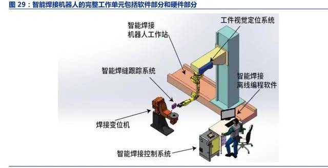 鋼構智能焊接機器人軟件部分占比約為 30%,對應市場空間約為 72 億元。目前市場上 尚未有成熟應用于鋼構領域的智能焊接機器人,我們以柏楚電子規(guī)劃生產的鋼構智能焊接機 器人及控制系統(tǒng)為例,其軟件部分包括智能焊接離線編程軟件(2.5 萬元/套)、智能焊縫跟 蹤系統(tǒng)(5 萬元/套)、智能焊接控制系統(tǒng)(2 萬元/套);硬件部分包括焊接變位機(5 萬元/套)、智能焊接機器人工作站(15 萬元/套)和工件視覺定位系統(tǒng)(2 萬元/套),因此 軟件部分的價值量占比約為 30%,在機器換人滲透率為 45%、1 臺機器可替代焊工 2.4 個 焊工的情況下,對應 2025 年鋼構智能焊接機器人整體市場空間約 240 億元,則軟件部分的 市場空間約為 72 億元。