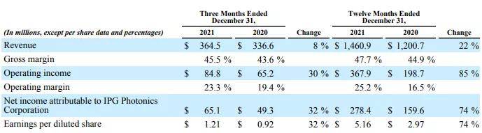 2月15日,光纖激光器巨頭IPG Photonics發(fā)布了2021年第四季度報告。報告顯示,IPG在2021年實現(xiàn)營收14.61億美元,同比增長22%;凈利潤2.78億美元,同比增長74%;毛利率47.7%,同比回升2.8個百分點(去年為44.9%)。