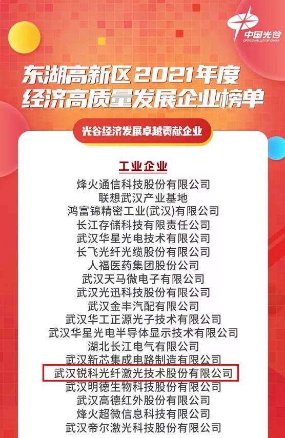2022年1月16日上午,東湖新技術(shù)開發(fā)區(qū)管理委員會(huì)召開“2022年東湖高新區(qū)工委(擴(kuò)大)會(huì)”,會(huì)議發(fā)布了《2021年度經(jīng)濟(jì)高質(zhì)量發(fā)展企業(yè)榜單》,帝爾激光和銳科激光上榜“20...
