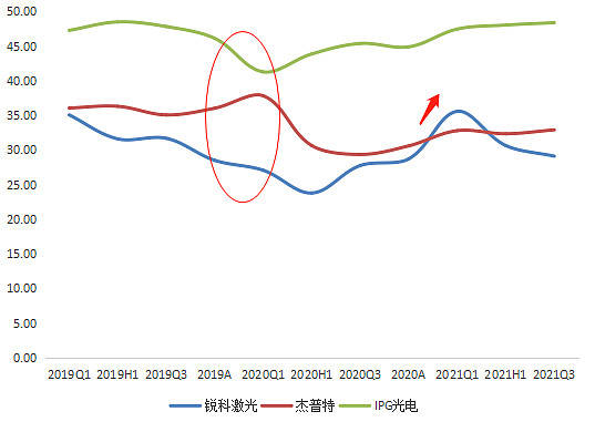 三家光纖激光器企業(yè)毛利率對(duì)比,來源:塔堅(jiān)研究