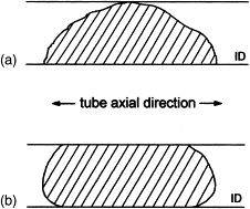 上圖給出了噴丸前后貫穿管壁的主應(yīng)力腐蝕裂紋形狀示意圖。噴丸前拉管的裂紋形狀為半橢圓形,裂紋長(zhǎng)度在管壁內(nèi)表面最大,在管壁內(nèi)減小。這種形狀類(lèi)似于在沒(méi)有kiss輥的情況下,在液壓膨脹管上觀察到的(Stubbe,1996, KAERI, 1992)。對(duì)于噴丸后產(chǎn)生的裂紋,管壁內(nèi)表面裂紋長(zhǎng)度比管壁內(nèi)裂紋長(zhǎng)度短0.1-0.7 mm左右。裂紋的最大長(zhǎng)度約為管壁厚的四分之一。在比利時(shí)工廠的噴丸管上也觀察到了這種凸起的形狀(Stubbe, 1996)。噴丸處理對(duì)裂紋的取向沒(méi)有影響;所有裂紋均為軸向或略向管軸傾斜。