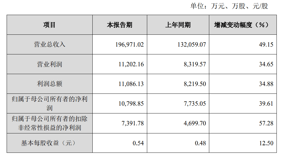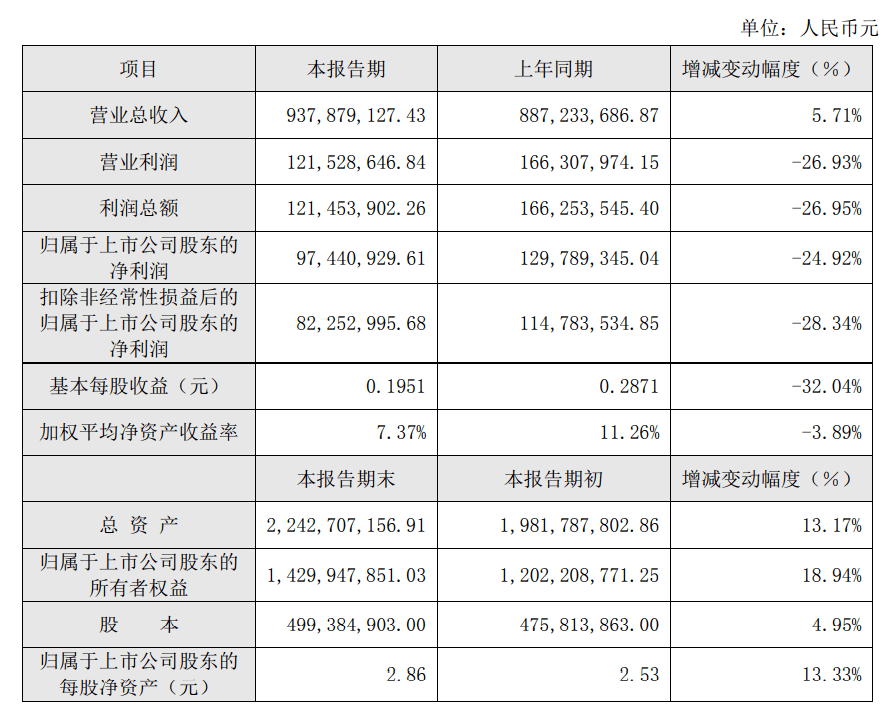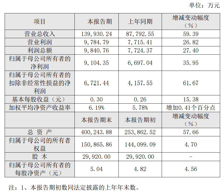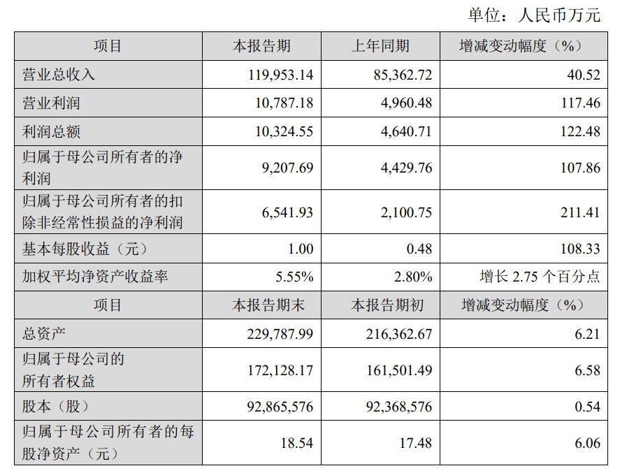 報告期內,公司實現營業(yè)收入 119,953.14 萬元,同比增長40.52%;實現利潤總額 10,324.55 萬元,同比增長 122.48%;實現歸屬于母公司所有者的凈利潤 9,207.69 萬元,同比增長 107.86%;報告期末,公司總資產229,787.99 萬元,較 期初增長 6.21%;歸屬于母公司的所有者權益 172,128.17 萬元,較期初增長 6.58%。