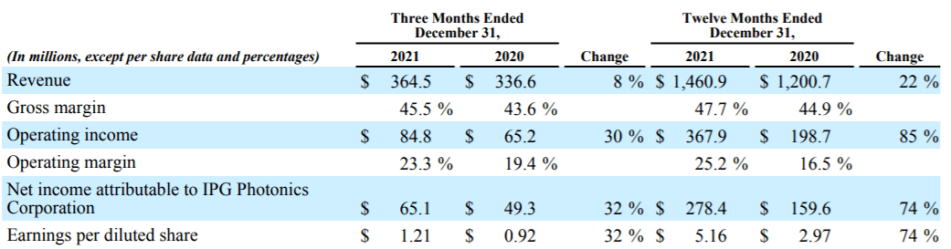 關于業(yè)績變動的原因,IPG的首席執(zhí)行官Eugene Scherbakov 博士提到,雖然中國市場表現疲軟,但歐洲、北美和日本市場的業(yè)績增長以及新興增長產品的貢獻增加,使第四季度的收入進一步多樣化并超出了預期?!爸袊袌鲆酝獾钠渌麉^(qū)域銷售額增長到總收入的69%,這是我們多年未見的水平,表明我們的業(yè)務更加平衡,我們將繼續(xù)專注多樣化的產品組合和機會,使我們能夠從自動化、小型化、可持續(xù)性和能源效率等主要宏觀趨勢中受益?!?/p>