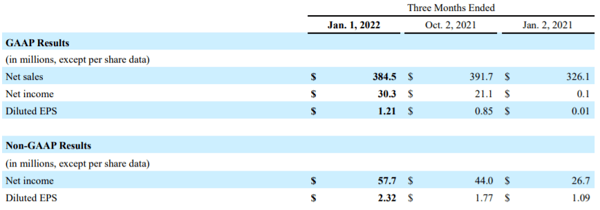 2月9日,Coherent公布了截至2022 年1月1日的第一財季財務業(yè)績。Coherent 2022財年第一季度的銷售額為3.845億美元,相比2021年第一季度3.261億美元的銷售額,同比增長了17.91%;凈利潤為3030萬美元,相比2021財年第一季度10萬美元的凈利潤,同比增長超300%。
