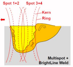 激光能量調(diào)節(jié)技術(shù)將 TruDisk 多芯光纖激光器的激光束分散在環(huán)型光纖和內(nèi)芯光纖之間。同時,聚焦光學器件將激光束分散成四個單獨的焦點。這些光束根據(jù)環(huán)形光纖與內(nèi)芯光纖形成的功率分布相疊加并根據(jù)彼此定位,因此能夠在同一熔池內(nèi)作業(yè),并形成一個持續(xù)打開的匙孔。