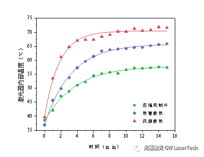 ▲ 不同風(fēng)冷方案激光器輸出1.5kW激光時(shí)溫度隨時(shí)間的變化