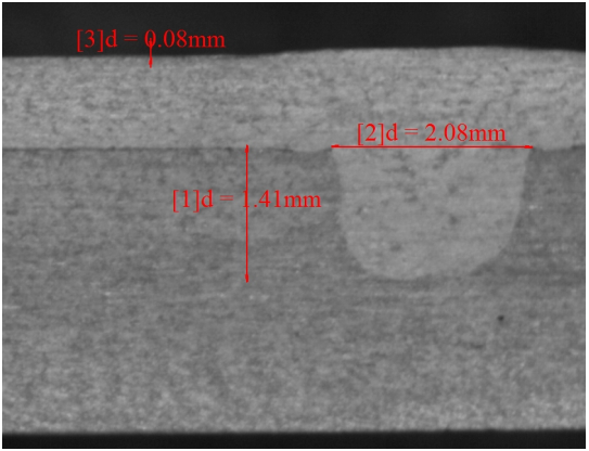 中心功率2900W,環(huán)形功率2300W,焊接速度80mm/s,焊接后拉力大小可以達(dá)到2kN遠(yuǎn)遠(yuǎn)大于要求的1kN;從焊縫截面圖可以看出焊縫內(nèi)部無(wú)裂紋缺陷,無(wú)氣孔,余高、塌陷等等都符合客戶要求。