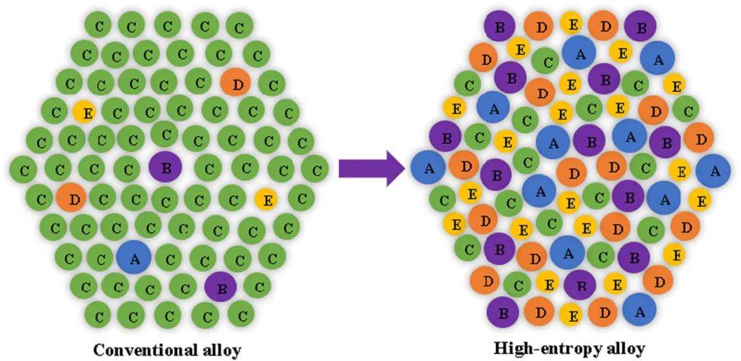 圖1 利用不同顏色的圓圈,描述了傳統(tǒng)合金和高原子化合金的原子結構差異,其中高原子化合金由五個核心元素(混合后的高構型熵)組成,而傳統(tǒng)合金只包含一個主元素。