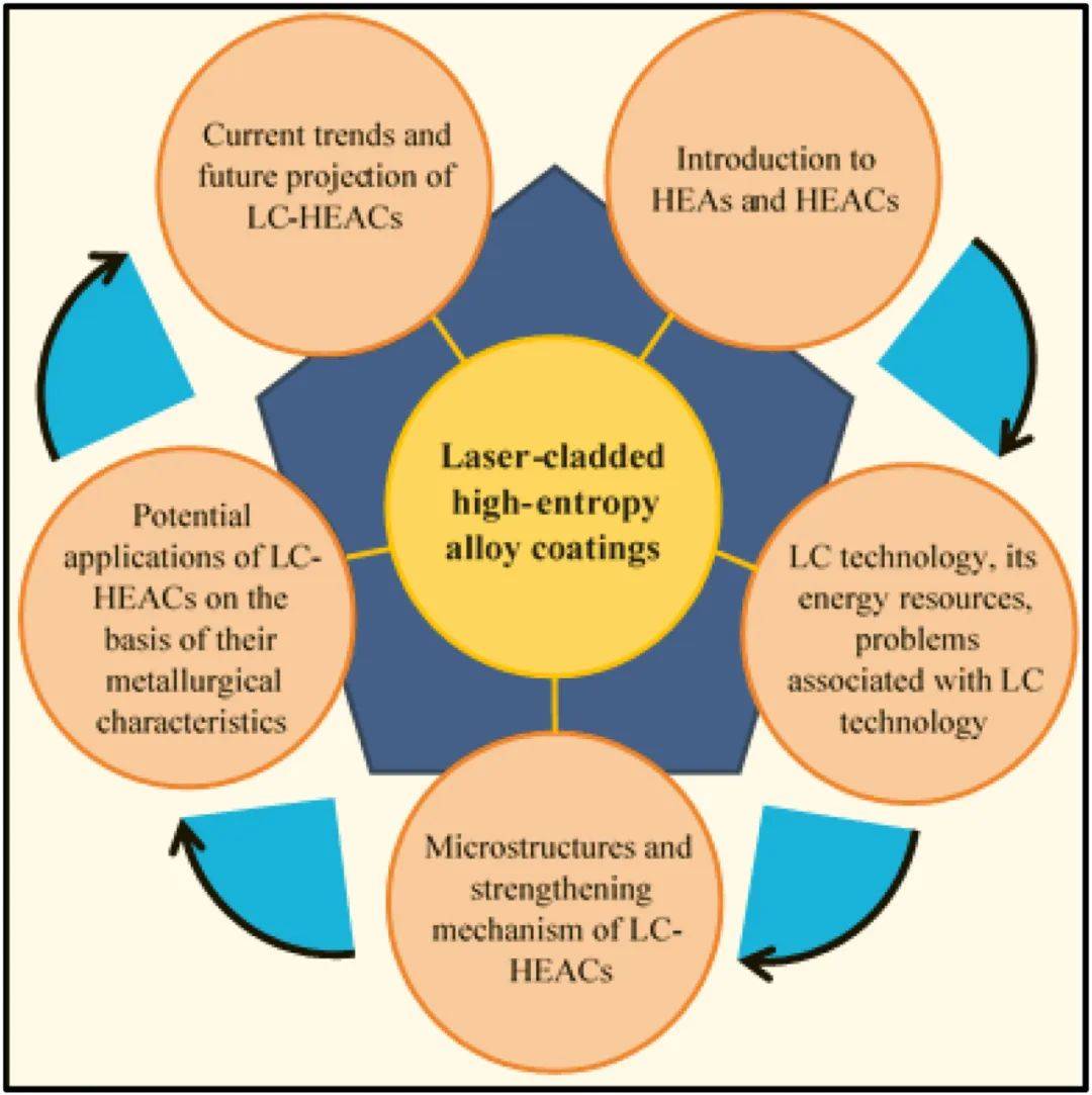 高熵合金(HEAs)是一類有前途的金屬材料,吸引了材料科學和工程的世界。這些耐人尋味的材料在惡劣的環(huán)境和苛刻條件下的涂料中證明了它們的價值。激光熔覆(LC)是一種應用于表面改性的非線性復雜,多學科和現代技術。與傳統(tǒng)合金相比,HEAs的更高級性能使研究界能夠探索激光包覆高熵合金涂層(LC-HEAC)。.本文綜述了LC-HEAC的最新趨勢,旨在探討LC技術在HEA材料中的應用,工藝參數對LC-HEAC幾何和冶金特性的影響。闡明了不僅限于微裂紋和殘余應力的常見缺陷,以及提高LC-HEAC質量的技術。