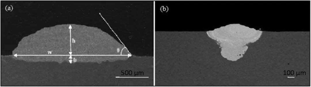 圖 9 顯示LC和LSA復合幾何形狀差異的掃描電鏡圖像;(a)激光包覆截面,稀釋比小,冶金粘結良好。此外,顯示包層參數的白線,其中 b = 包層深度,w = 包層寬度,h = 包層高度,θ = 包層角度;(b)激光表面合金橫截面,顯示基材和復合材料之間的混合程度更高,沒有明顯的區(qū)別。