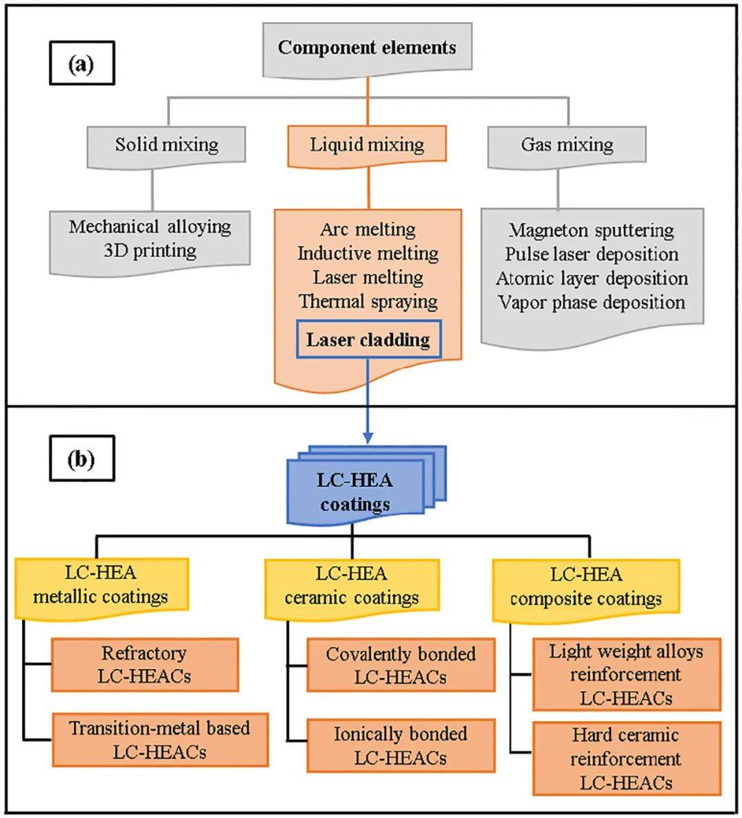 圖4 (a)激光包覆屬于液體混合范疇的HEAs合成路線;(b)根據元素類型對LC-HEACs進行分類。