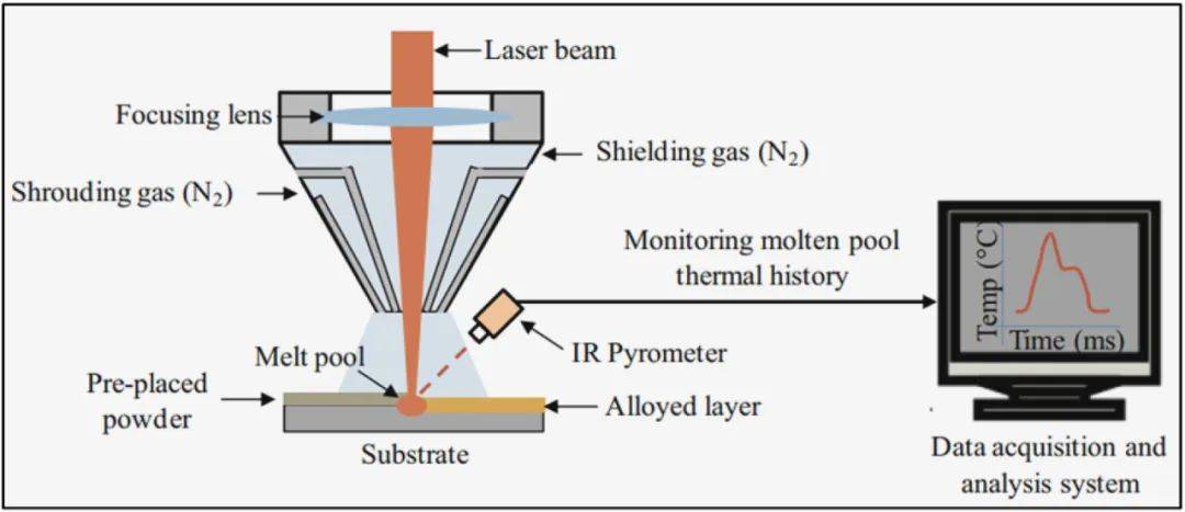 圖 7 激光熔覆技術示意圖,其中粉末預先放置在基板表面上,惰性環(huán)境由來自同軸噴嘴的屏蔽氣體產生。數據采集系統(tǒng)測量時間-溫度歷史,以便更好地了解激光-材料相互作用。