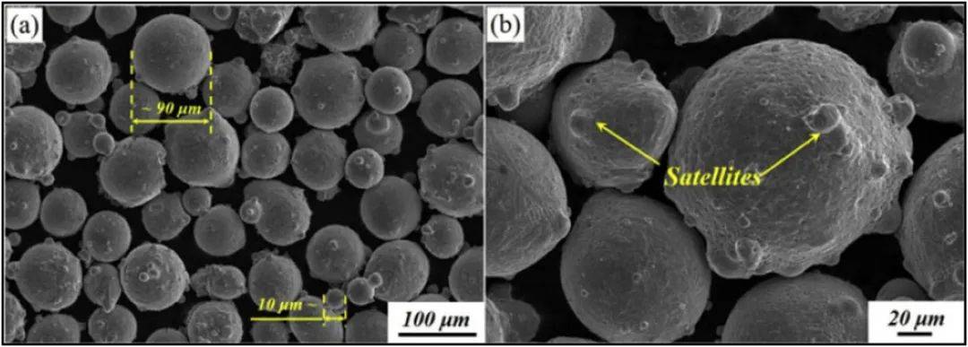 圖5 氣霧化法制備fecrconimn基合金粉末的顯微圖像(a)粒徑為10 ~ 90?μm的球形顆粒形態(tài);(b)放大視圖,顯示球形幾何周圍存在衛(wèi)星粒子。
