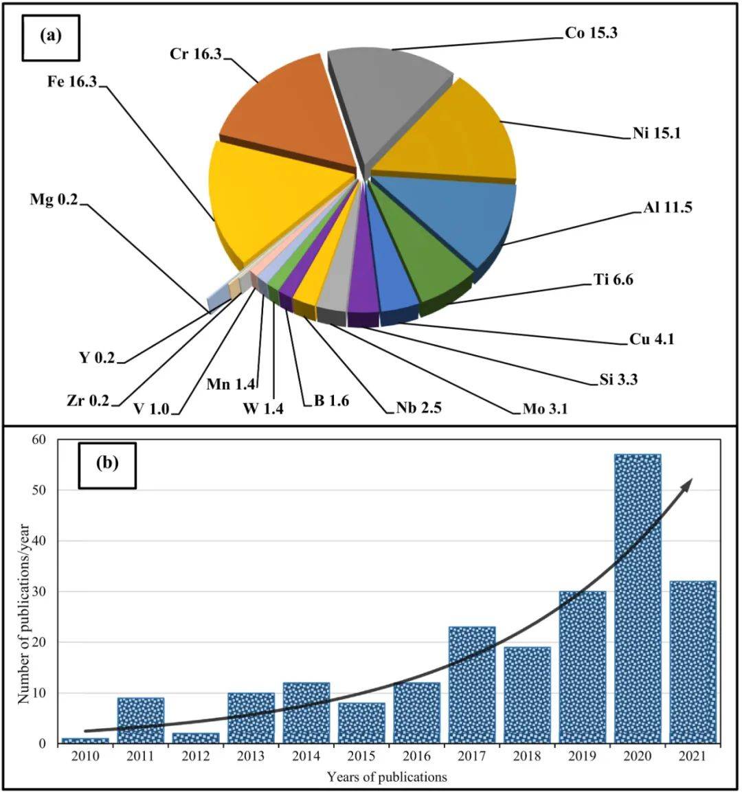 圖10 (a)提取100多篇經同行評審的LC-HEACs文章的數據,繪制餅圖,描繪HEA元素的出現百分比;(b)柱狀圖顯示了從Web of science?獲得的2010年至2021年LC-HEACs在近年來發(fā)表的論文數量急劇增加。