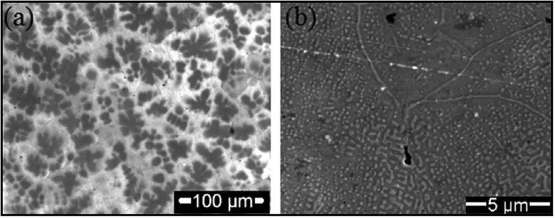 圖11 在連續(xù)模式和脈沖模式下,掃描電鏡顯示了鋁fenicr包層的等軸枝晶表面形貌。這也驗證了LC技術在兩種模式下都包含了枝晶結構,然而,由于與之相關的高冷卻速率,脈沖模式只將FCC轉換為BCC;(a)等軸枝晶組織內部存在析出相;(b)放大的視圖,描繪了等軸排列的顆粒,以及調制的沉淀物和沉淀物無區(qū)。
