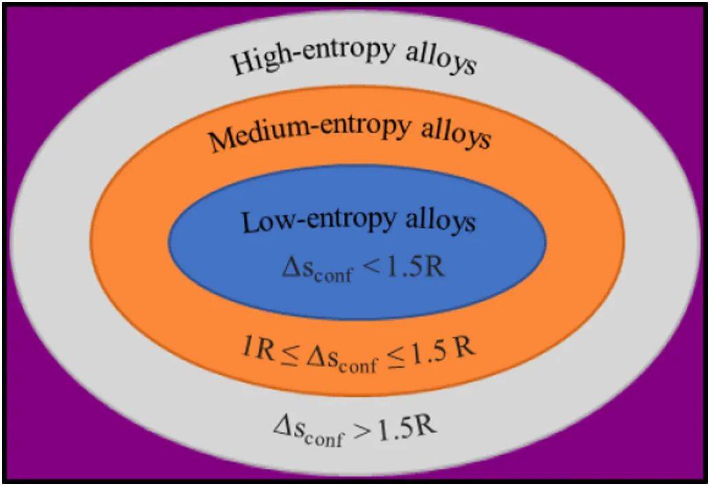 圖3 根據基于熵的定義對合金體系進行分類,其中HEA的混合構型熵(ΔSconf)為>1.5 R (R?=?8.3143?J/mol?1?K?1)。
