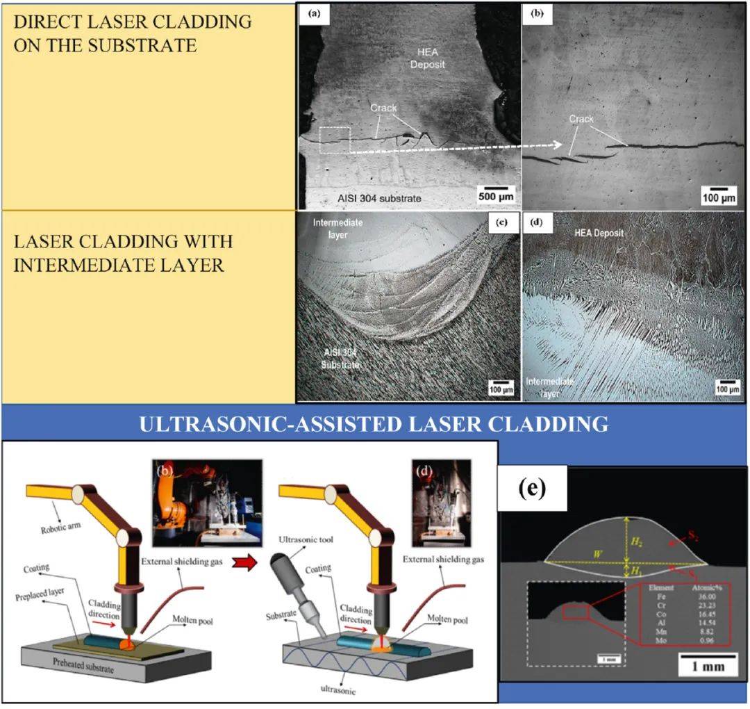 圖16 SEM觀察了alfenicocr基LC-HEACs的截面及中間層對其顯微組織的影響;(a、b)界面區(qū)成分失配引起的裂紋形貌圖;(c, d)界面結(jié)合良好的枝晶形貌。此外,引入CoNiFe2作為中間層后,由于復(fù)合材料具有更好的混溶性和溶解度,沒有出現(xiàn)裂紋;(e)預(yù)熱基底和超聲輔助激光熔覆設(shè)備圖,超聲系統(tǒng)以20kHz的頻率振動,SEM顯微圖顯示良好的冶金結(jié)合,無微裂紋和氣孔。它還減輕了殘余應(yīng)力。