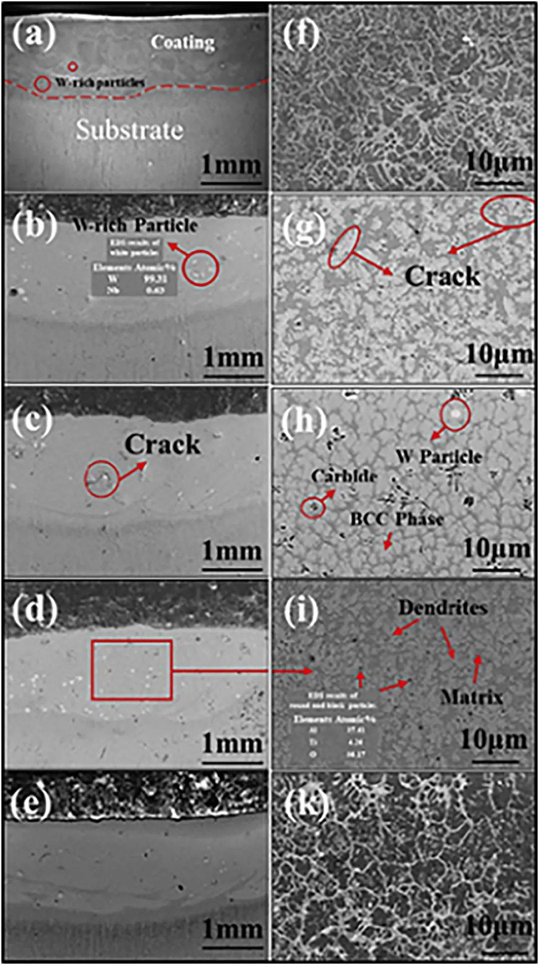 圖14 不同激光功率下制備的AlMoFeCrTiWNb材料的SEM顯微形貌;(a, f)在最低激光功率為2.4kW時,晶界處形成了具有析出相的典型不規(guī)則枝晶組織;(b, g)白色表示在較低的激光功率2.6kW下的W未熔化粒子。由于晶格畸變,熔覆層中存在少量微裂紋;(c, h)當(dāng)激光能量密度為2.8kW時,不規(guī)則組織向規(guī)則枝晶組織轉(zhuǎn)變,碳化物晶粒尺寸增大;(d, i)在3kW時,包層未發(fā)現(xiàn)微裂紋。然而,毛孔仍然很少;(e, k)白色粒子在3.2kW時消失,因?yàn)楦呒す馐芰客耆诨烁粀粒子。