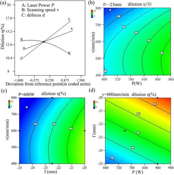 激光熔覆工藝參數(shù)對稀釋度的影響:(a)工藝參數(shù)攝動圖;(b) P, v等高線圖;f (c), v;(d) P f。