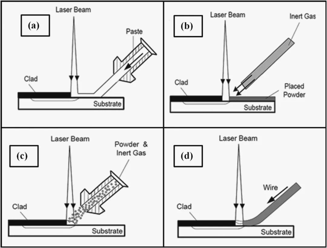圖 12.不同類型的粉末進(jìn)料系統(tǒng);(a)需要激光沉積漿料的熔融技術(shù);(b)采用預(yù)先放置的粉末進(jìn)行激光沉積的重熔技術(shù);(c) 在激光作用期間通過噴嘴輸送粉末的粉末噴射技術(shù);(d)需要以鋼絲為原料的送絲技術(shù)
