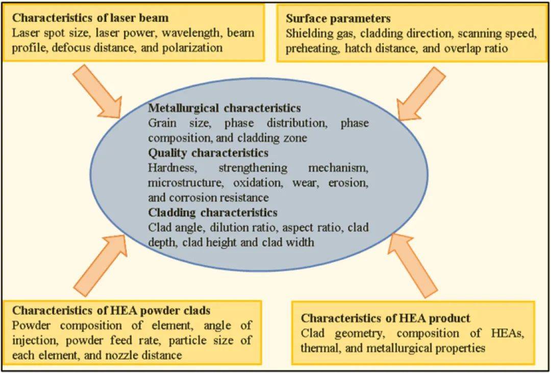 在任何工程現(xiàn)象中,精確控制工藝參數(shù)對于獲得高性能是必要的。同樣,LC技術(shù)中存在各種激光加工參數(shù),這些參數(shù)會影響熔覆層的特性。圖13顯示了LC-HEAC特性對激光加工參數(shù)和粉末特性的依賴性。激光束的處理參數(shù)分為四種類型:激光束的特征包括激光光斑尺寸,激光功率,波長,光束輪廓,散焦距離和偏振。然而,表面參數(shù)包含保護(hù)氣體、熔覆方向、掃描速度、預(yù)熱、艙口距離和重疊比。而HEA產(chǎn)品的特性包括包層幾何形狀,HEA的組成,熱和冶金性能,以及HEA粉末包層的特征包括元素的粉末組成,注射角度,粉末進(jìn)料速率,每個元素的粒徑和噴嘴距離。粉末的特性已在上一節(jié)中討論。從冶金特性、質(zhì)量特性和熔覆特性方面研究了LC-HEAC的質(zhì)量。激光加工參數(shù),特別是激光功率、掃描速度、散焦距離、激光光斑尺寸、重疊比以及粉末進(jìn)給率需要優(yōu)化,以獲得改進(jìn)的LC-HEAC。