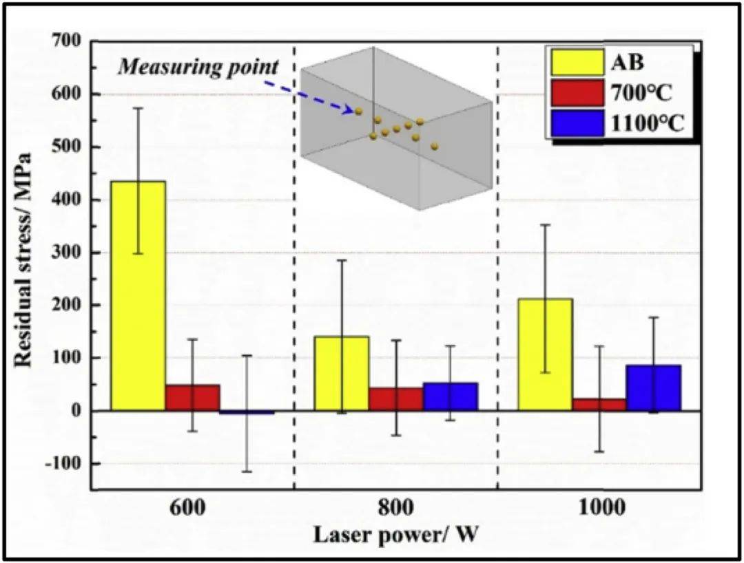 圖17 圖為在不同激光功率下,700°C和1100°C試件的實(shí)測殘余應(yīng)力。殘余應(yīng)力隨加熱時間的延長而降低。由于淬火速率高,激光功率越低,殘余應(yīng)力越大。此外,固化包層收縮體積的減弱增加了殘余應(yīng)力,為1kW。