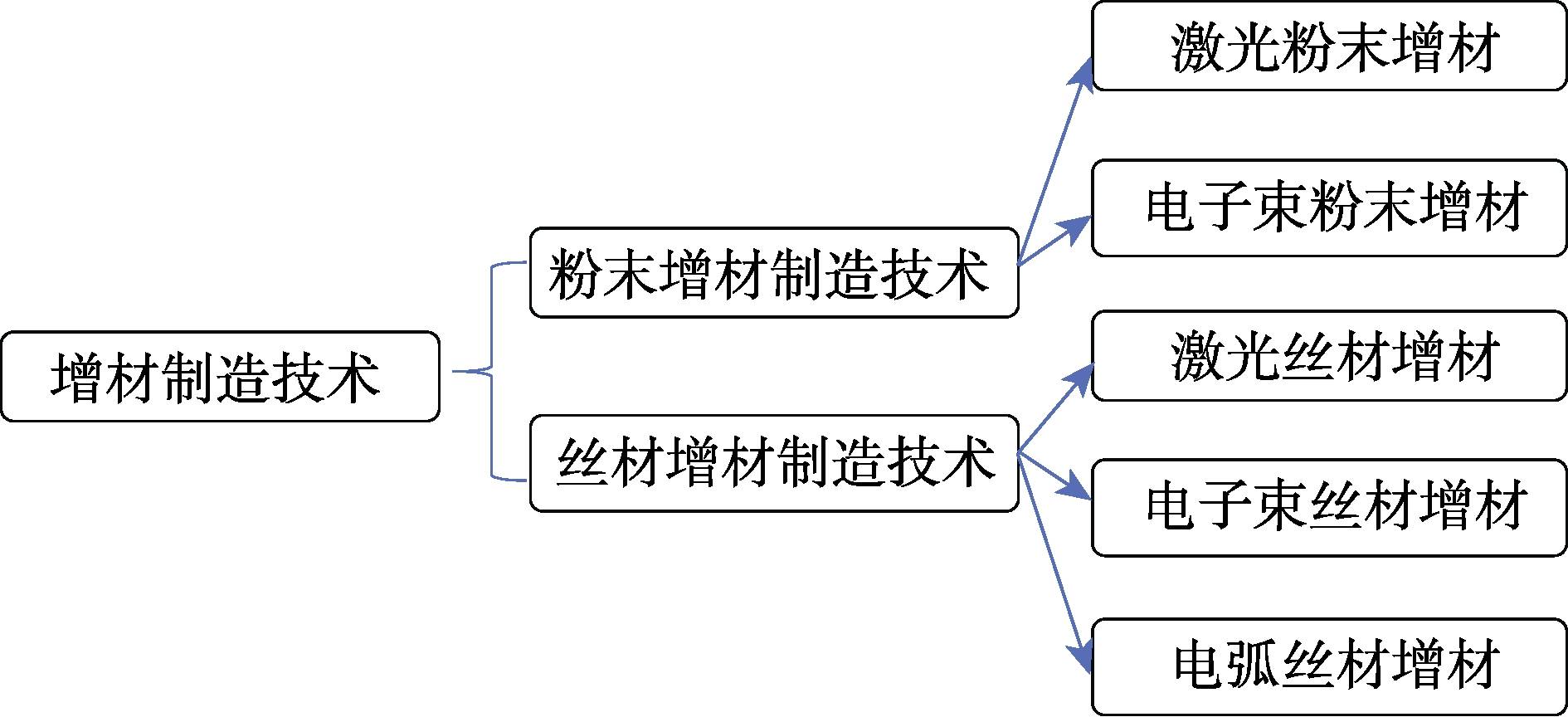 相較于傳統(tǒng)的減材制造,增材制造技術(shù)是利用計算機輔助設(shè)計進行三維實體分層切片,然后進行二維堆積,最后將得到的實體產(chǎn)品從基板上取下,進行后處理以強化性能[3],常見的增材制造工藝如圖2所示。這種特殊的制造方式不僅有效節(jié)約了原材料,并且能夠快速制造一些結(jié)構(gòu)復雜、成形工藝繁瑣的產(chǎn)品,這無疑為小批量的定制產(chǎn)品提供了一種低成本、短周期的制造方式[4]。增材制造工藝本身也有著一定的局限性,就現(xiàn)階段而言,大規(guī)模生產(chǎn)能力還不足,同時部分增材制造工藝對基材狀態(tài)要求較高,這也變相地增加了生產(chǎn)成本。這些問題在未來的研究中仍需要進一步地解決和改善。