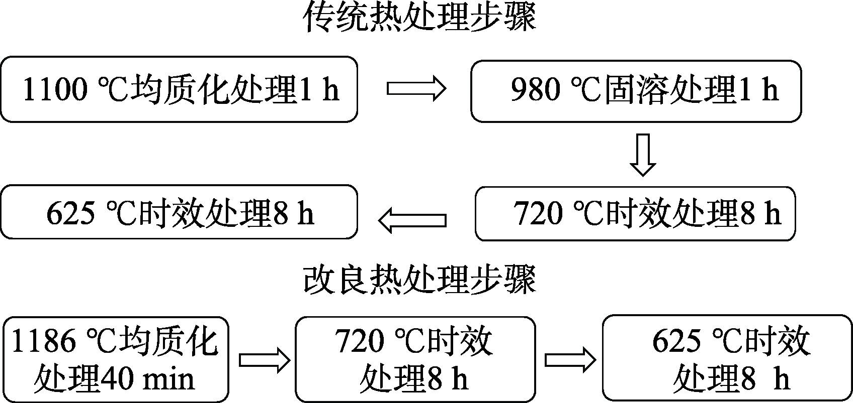 為了減少增材制造中Inconel 718合金的微觀偏析現(xiàn)象和Laves相的數(shù)量,Cui等[43]還通過對均質(zhì)化熱處理步驟進行改良,取消了980 ℃固溶熱處理,將均質(zhì)化處理的溫度提高了1186 ℃,并縮短了均質(zhì)化處理時間,改進前與改進后的熱處理對比如圖5所示。該工藝有效減弱了晶界處的微觀偏析現(xiàn)象以及Laves相的析出。