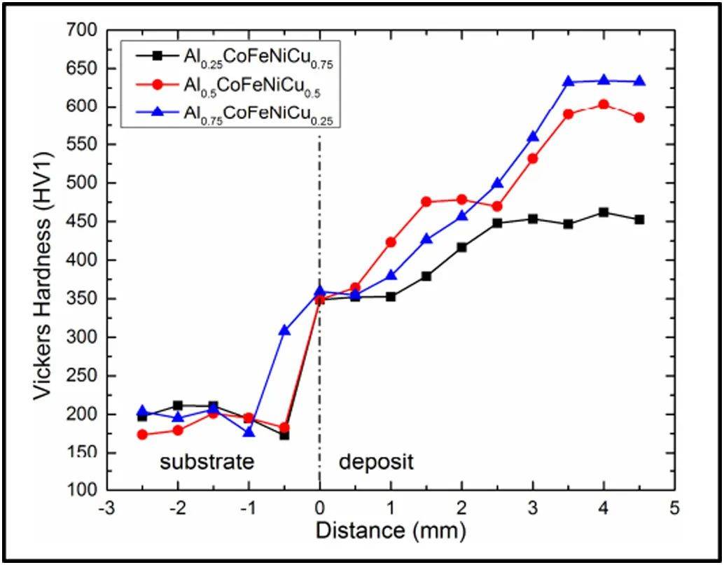 Xu等利用LC技術(shù)在AISI 1045鋼上制備了FeNiCoCrTiAlx(0≤x≤2)HEACs,發(fā)現(xiàn)al含量的加入使其顯微硬度增加,在x=0.5后降低。Al原子半徑越大,晶粒尺寸失配越大(以固溶強(qiáng)化為主),F(xiàn)CC相向穩(wěn)定的BCC相、laves相的轉(zhuǎn)變以及晶粒的細(xì)化均有助于硬度的提高。