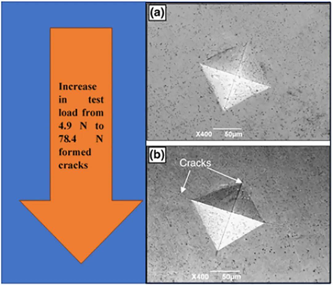 圖26 6fenialcocrtisi基LC-HEACs熱處理表面兩種不同試驗(yàn)載荷下壓痕的顯微截面圖像(a) 4.9N的壓痕標(biāo)記;(b) 78.4N的壓痕導(dǎo)致微裂紋,表明熱處理后影響了抗斷裂性能。