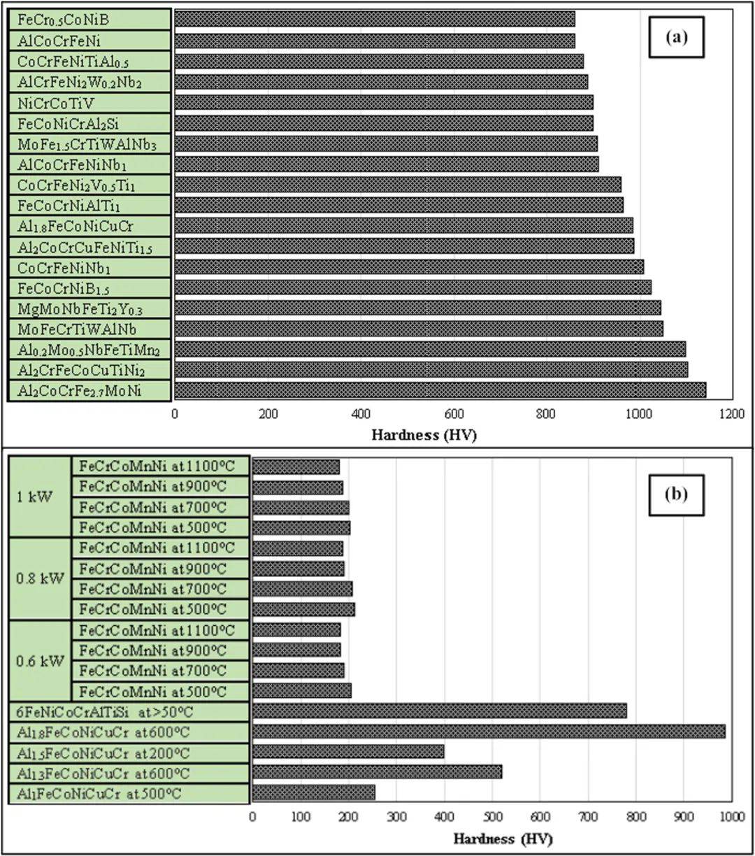 固溶體強(qiáng)化:固溶體對(duì)含有四種以上不同結(jié)構(gòu)元素的HEAs的影響是重要的。這些HEAs合金元素導(dǎo)致晶格畸變,影響固溶相結(jié)構(gòu)和機(jī)械性能,尤其是硬度。如上一節(jié)所示,LC-HEACs的淬火速率高,熔覆層致密,成分分布均勻,組織細(xì)化。結(jié)果表明,相同成分的lc -HEAC的硬度優(yōu)于其他HEAC技術(shù)。不同研究文章的硬度數(shù)據(jù)(見(jiàn)圖23)顯示,LC-HEACs的顯微硬度大多是通過(guò)固溶強(qiáng)化而提高的。關(guān)于LC-HEACs的強(qiáng)化機(jī)制有很多報(bào)道,研究者研究了某些合金元素的加入對(duì)通過(guò)LC技術(shù)合成的非等摩爾HEACs的影響。